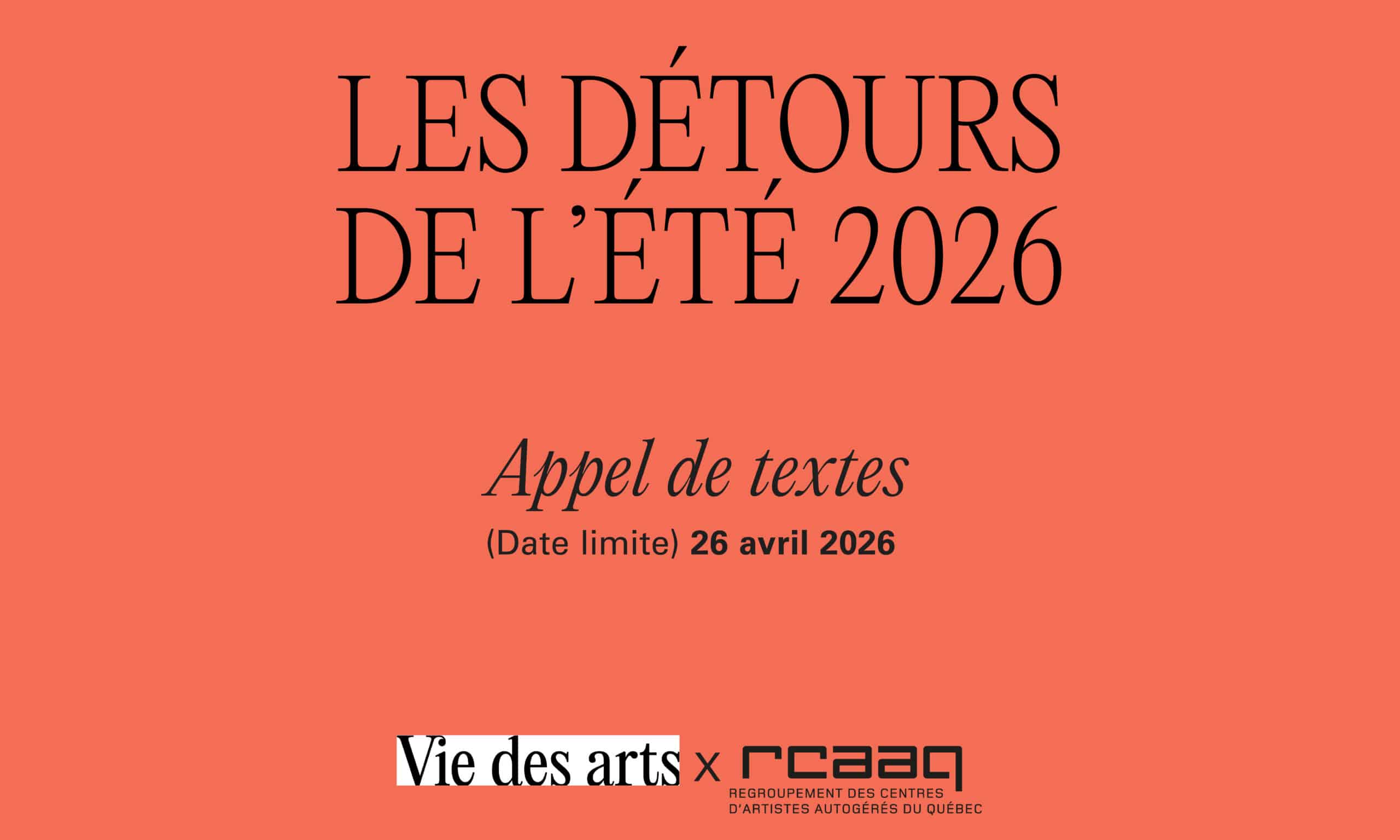 Le RCAAQ et Vie des arts lancent l’appel de textes Les détours de l’été, en écho au cahier éponyme publié de 2021 à 2023, consacré à l’actualité artistique estivale. Cette nouvelle mouture, déployée comme un espace éditorial virtuel exclusif, vise à encourager des écritures critiques attentives aux spécificités territoriales et aux conditions dans lesquelles les œuvres émergent.
